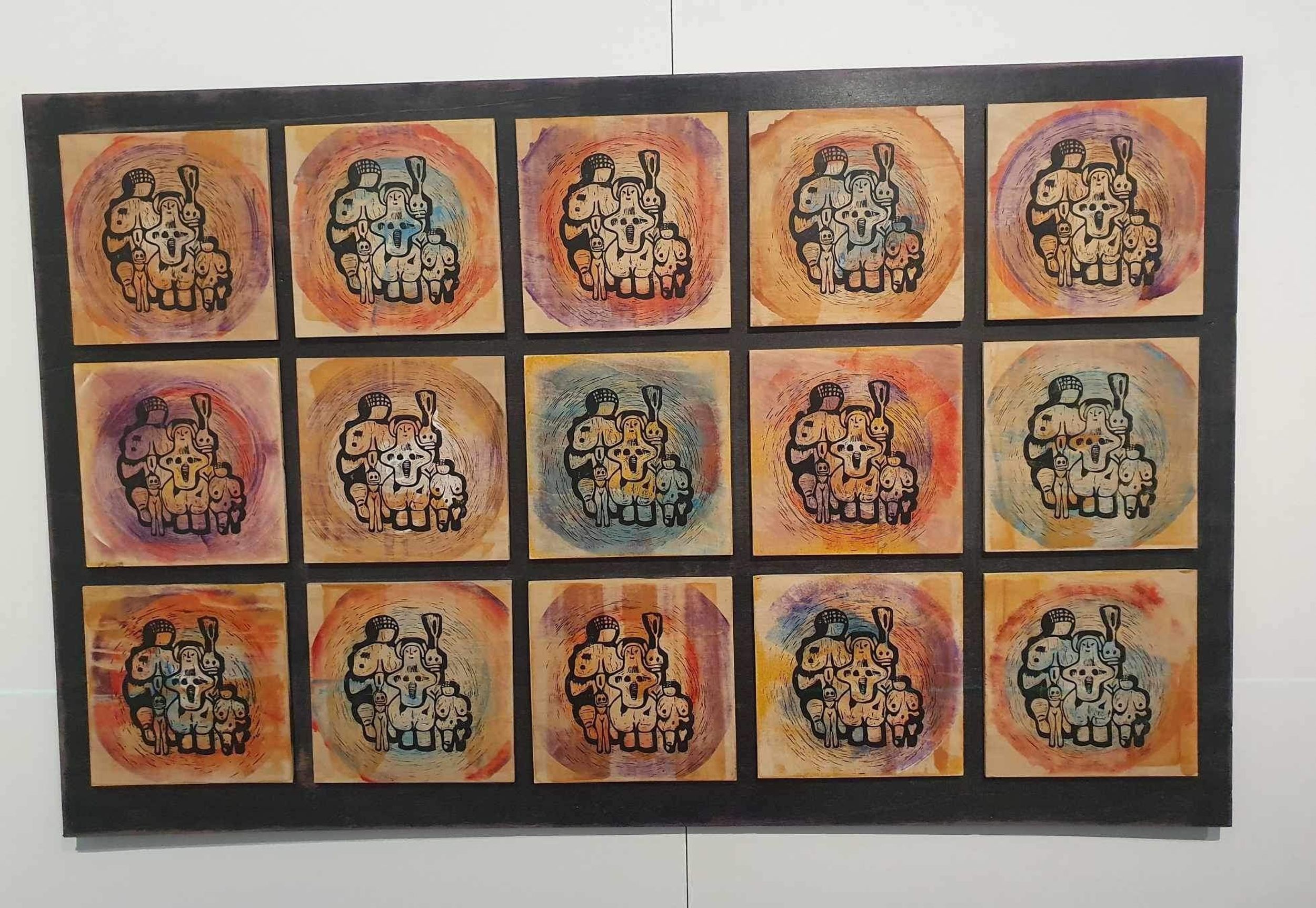 My fascination for the Venus figurines resulted in drawings of figurines from a variety of cultures and time. My passion for printmaking is influenced by Japanese printmakers and I was immediately stunned by the beauty of the Jomon Venus, a female shaped figure from the Jomon period (3000 – 2000BC). My early drawings of the Jomon Venus informed the development of the print for this series. She is accompanied by other figurines, ‘The Venus of Willendorf’ looms behind her while others surround and support. Not alone, she is a member of a community of women. The activated, grattage backgrounds stimulates the viewer visually while the figures reside comfortably, safely within the composition. The work is both exciting and calming . These attributes embrace key ideas of womanhood both literally visually and non - literally emotionally, and the audience is invited into consideration of the duality of this while also embracing the importance of standing strongly together in our contemporary context.